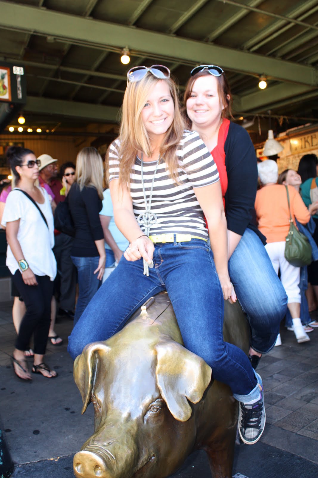 my family and i took ourselves down to the pike place market area. i was here when i was a kid and remember being just blown away by all the fish throwing. it seemed like non-stop fish flying through the air and sitting up on my dad's shoulders was the only way to watch this properly with the amount of people who had bunched in to watch and buy themselves some seafood. this time around it was a little slower, with the fish men asking out for who wanted something and all of us sheepishly standing there looking around for someone to say something so we could get a free show. either way, it was still fun checking out the market and taking a stroll 'round the city.